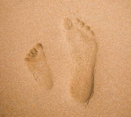 Source: Nikkytok. Child and adult footprints on sand beach stock photo.